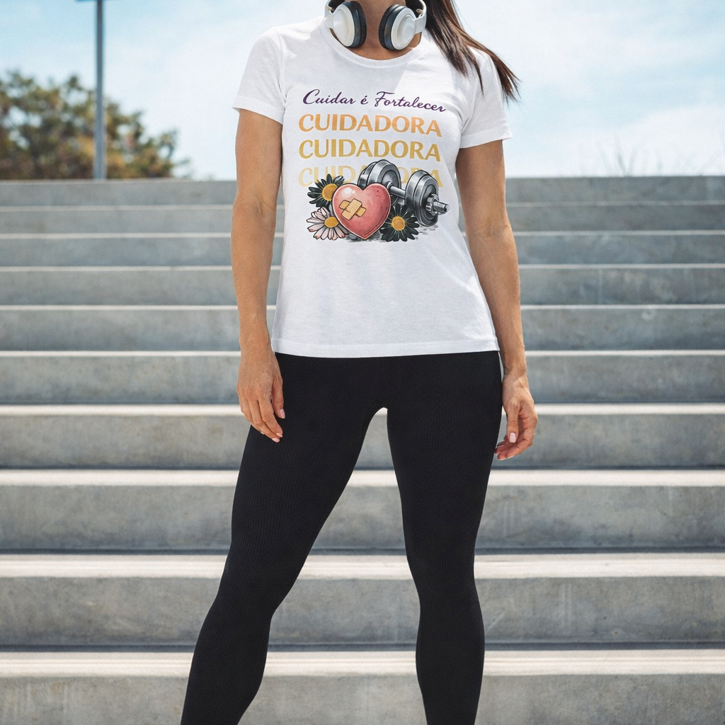 A camiseta Cuidadora: Cuidar é Fortalecer conecta o universo do cuidado com o mundo fitness, representando mulheres que dedicam energia, atenção e empatia todos os dias — sem esquecer da própria força física e emocional.