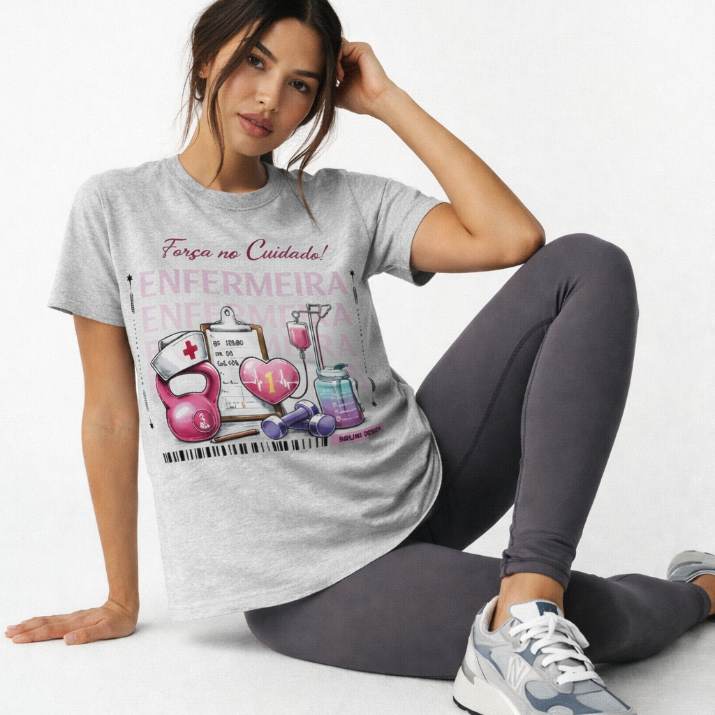 A camiseta Enfermeira: Força no Cuidado une o universo da enfermagem ao mundo fitness, representando mulheres que vivem uma rotina intensa, onde o cuidado com o outro caminha lado a lado com força física, equilíbrio e resiliência.