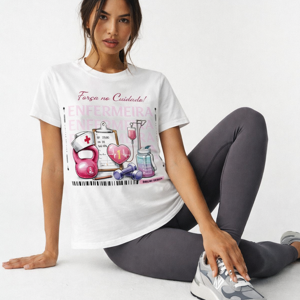 A camiseta Enfermeira: Força no Cuidado une o universo da enfermagem ao mundo fitness, representando mulheres que vivem uma rotina intensa, onde o cuidado com o outro caminha lado a lado com força física, equilíbrio e resiliência.