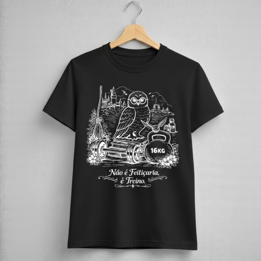 A camiseta Não é Feitiçaria, é Treino traduz, de forma criativa e bem-humorada, a verdade por trás da evolução física: não existe magia sem esforço. O que parece sobrenatural para quem vê de fora é, na realidade, fruto de disciplina, repetição e dedicação.