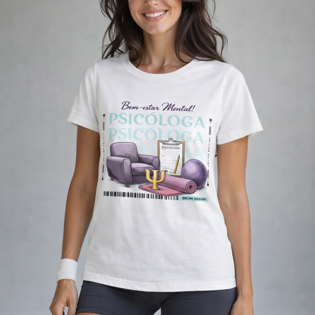 A camiseta Psicóloga: Bem-Estar Mental une o universo da psicologia ao mundo fitness, representando a importância do equilíbrio entre corpo, mente e emoções. Uma peça pensada para mulheres que entendem que saúde mental se constrói com presença, movimento e autocuidado.
