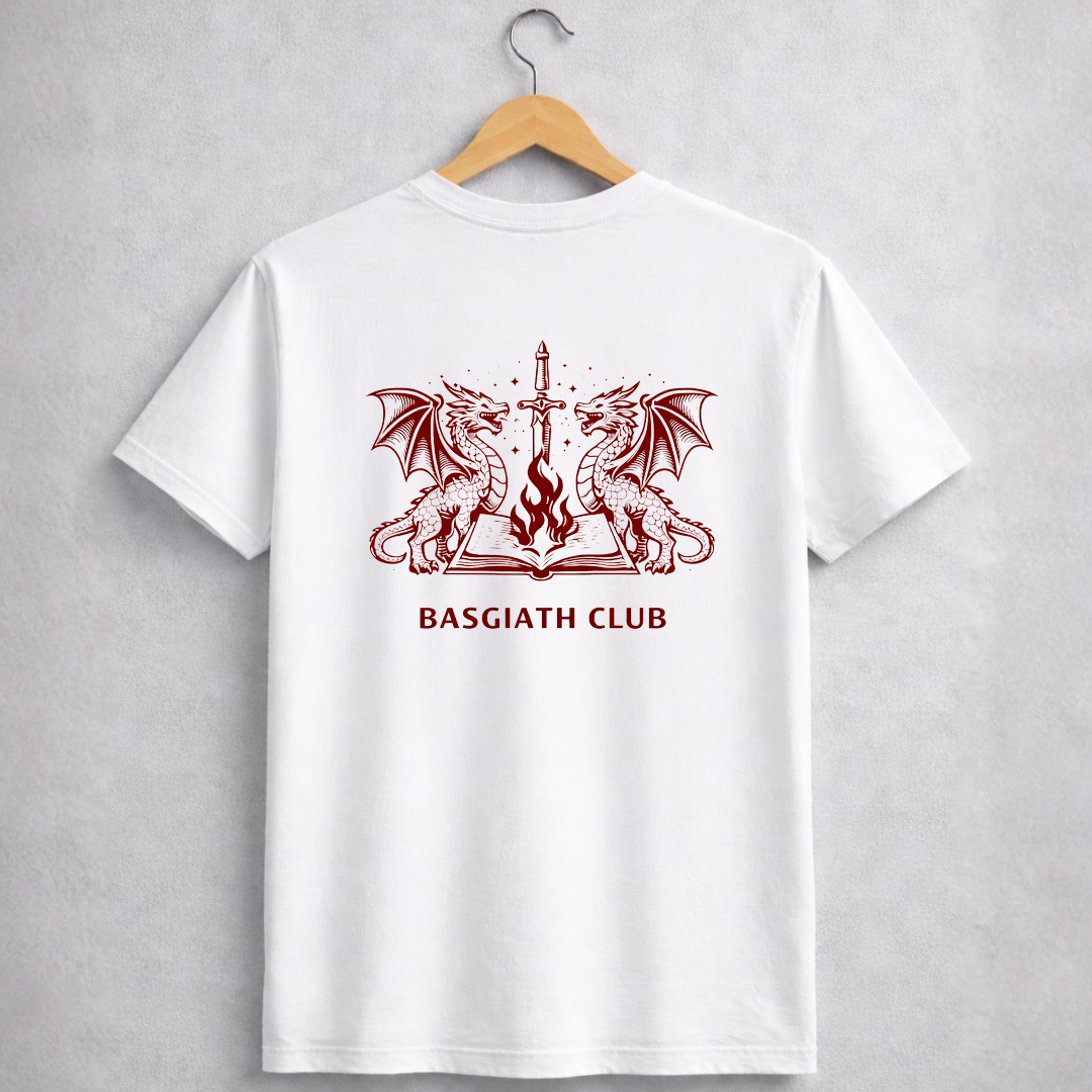 A estampa Basgiath Club traz símbolos de um dos institutos mais temidos e respeitados de um mundo onde apenas os mais fortes sobrevivem. Entre dragões, lâminas e livros antigos, surge o emblema de quem sabe que coragem, estratégia e determinação são essenciais.