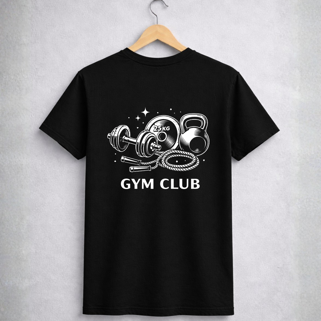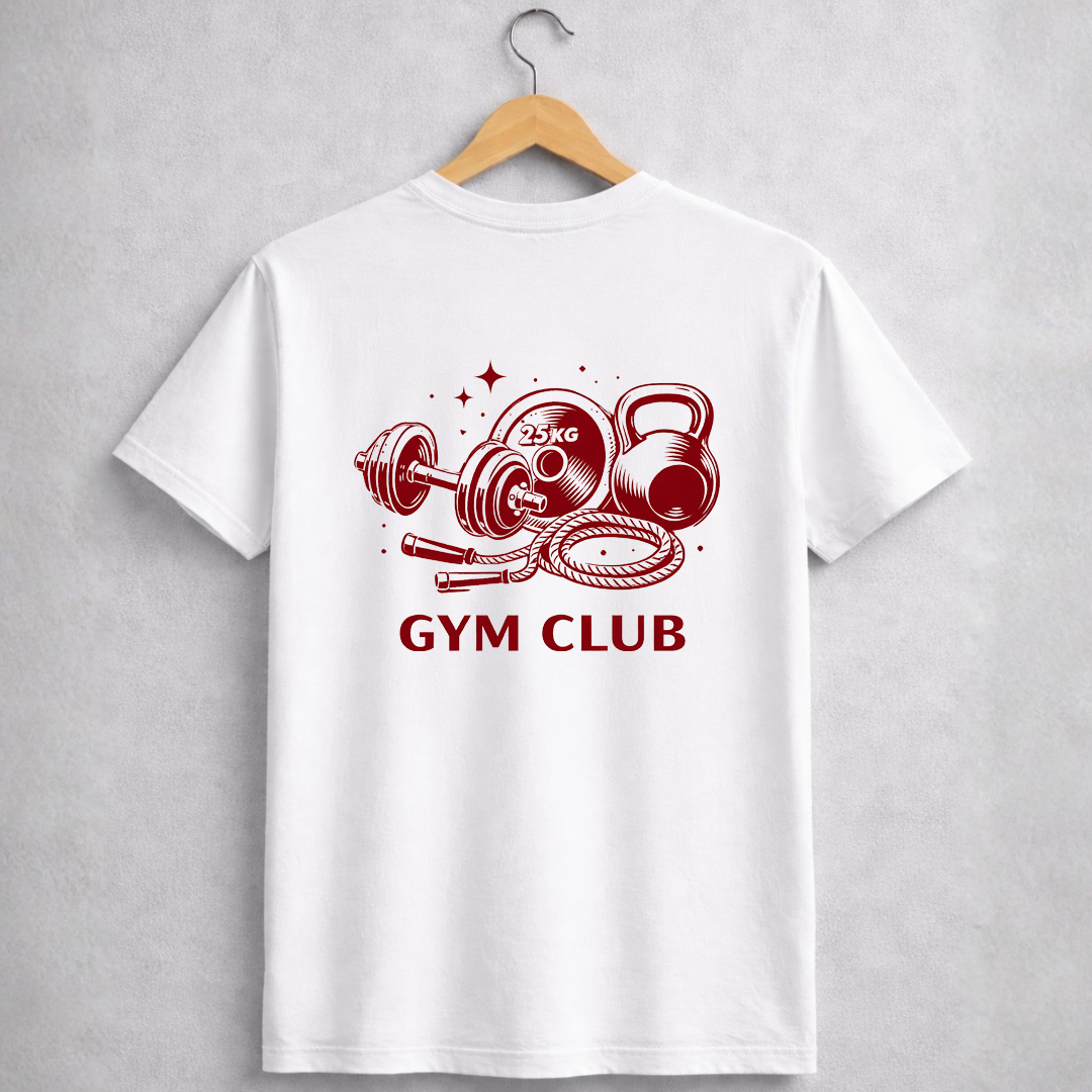 A estampa Gym Club representa a essência do treino: peso, foco e constância. Entre halteres, kettlebells e cordas de treino, nasce o símbolo de quem encontra na academia um lugar de evolução diária.