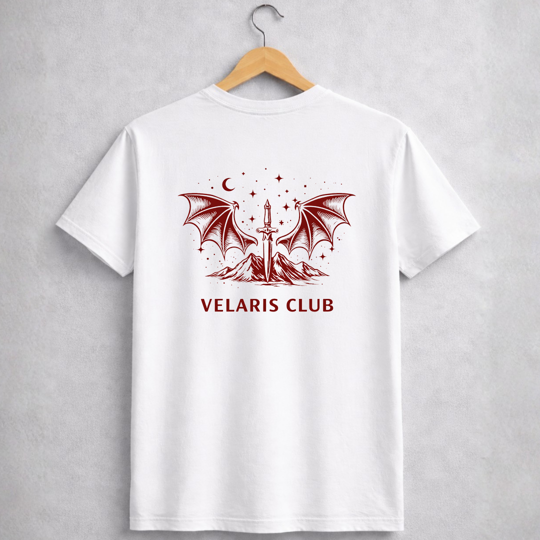 A estampa Velaris Club é uma homenagem a uma cidade escondida entre montanhas, protegida pela noite e iluminada por sonhos. As asas abertas, a lua e as montanhas formam um símbolo para leitores que conhecem bem os segredos da chamada Cidade das Estrelas.